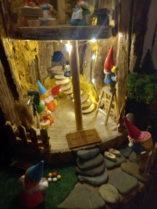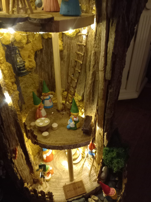 dit poppenhuis is met de hand gemaakt van een holle boomstam en ingericht met onze miniaturen en bevat verlichting! ( Werkend op batterij)